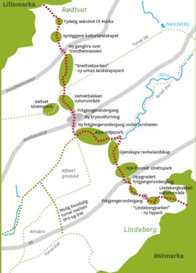 Nå skal vi - med noen endringer - følge ruten på dette kartet fra en brosjyre om Grønn tverrforbindelse: